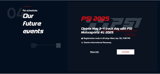 Ми розробили корпоративний іміджевий сайт для PSI Motorsports, який не лише відображає дух бренду, а й забезпечує зручний користувацький досвід. На сайті створено простий та інформативний календар івентів, що дозволяє швидко дізнатися про майбутні заїзди, отримати детальну інформацію про них та перейти на ресурс для замовлення квитків. Також реалізовано можливість подати заявку на тест-драйв або заїзд на одному з автомобілів компанії. Окрему увагу приділено висвітлення благодійної діяльності на підтримку України.