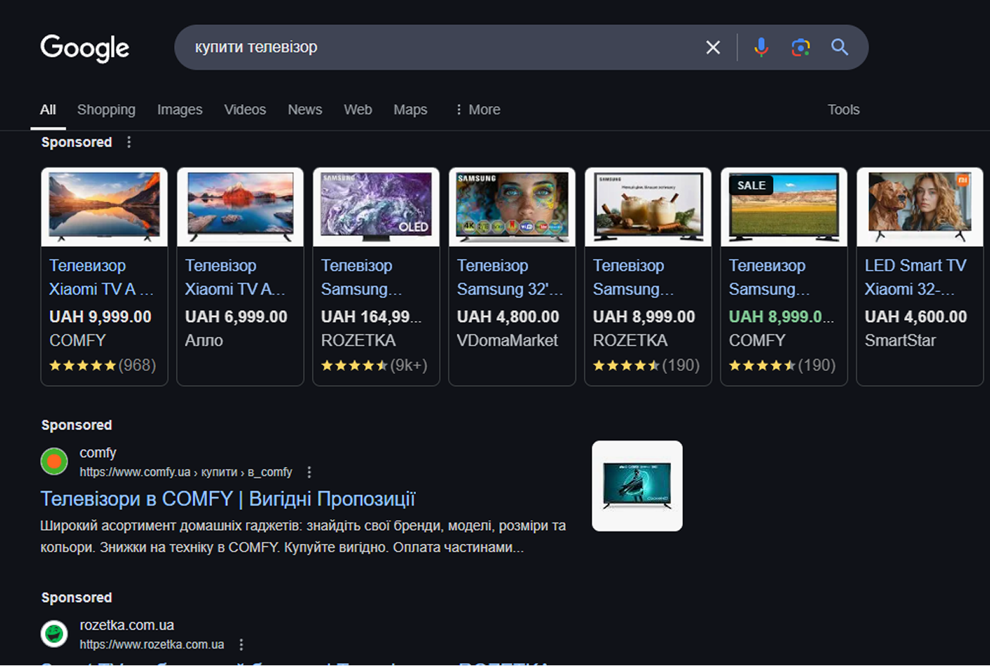 Коли людина шукає, наприклад, “купити кросівки Nike” — вона одразу бачить зображення товарів, ціну, магазин і навіть відгуки.